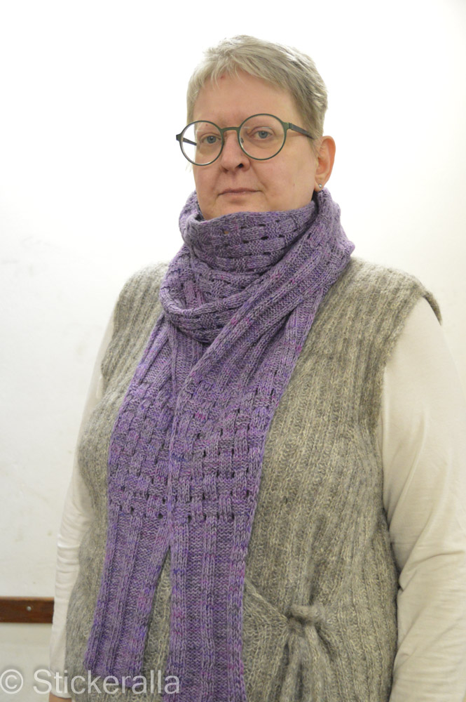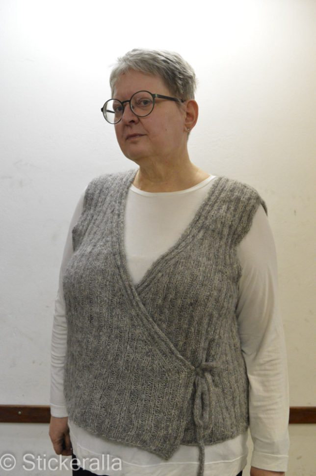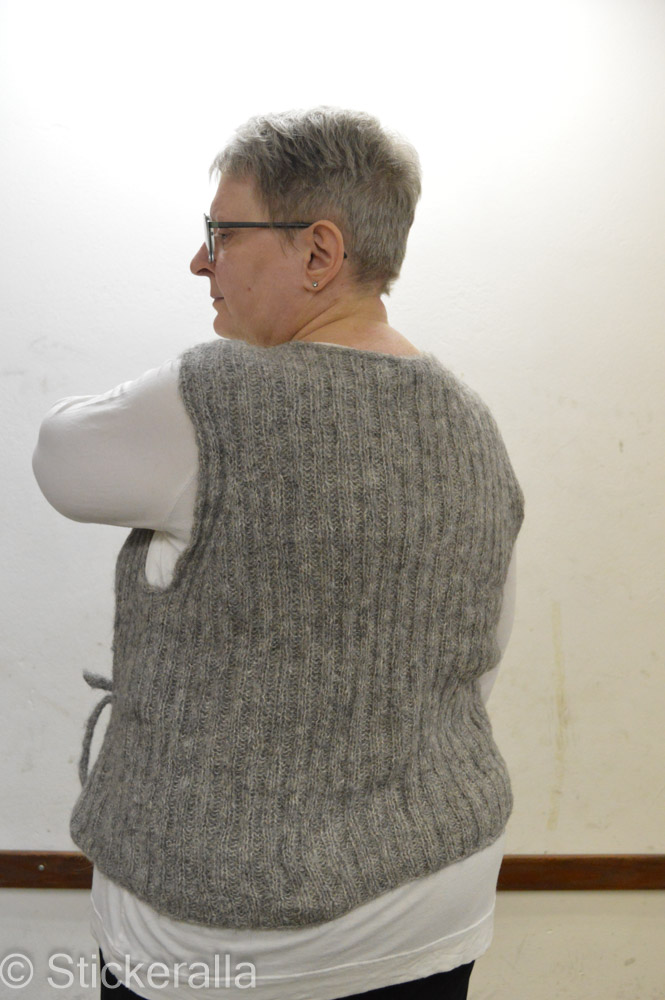 Det här är Lange Linjer Wrap av Elsebeth Judith. Resårstickning drar ju ihop sig en hel del… men inte om man använder ett stumt garn som Permin Nanna (alpacka, bomull och merino). Det borde jag kanske kommit ihåg, men det gjorde jag inte. Står jag still så här så syns det inte allt för mycket, men den här västen är stooor.